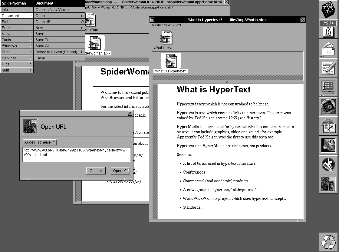 SpiderWoman was one of the earliest web browsers, browsers responsible for creating the web experience we take for granted today. Here is it shown rendering the world’s first web page, republished for posterity. Continue reading SpiderWoman for NeXT Comptuers