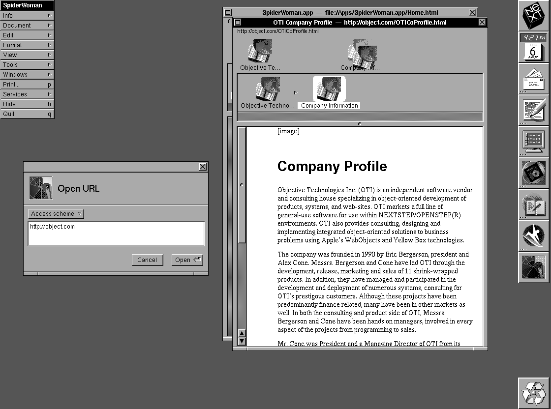 SpiderWoman early web browser viewing object.com home of Object Technologies Inc, a website without javascript, without analytics…just plain HTML and you’ll notice the images don’t render either. No inline images in the earliest web. Continue reading SpiderWoman browser for NeXT
