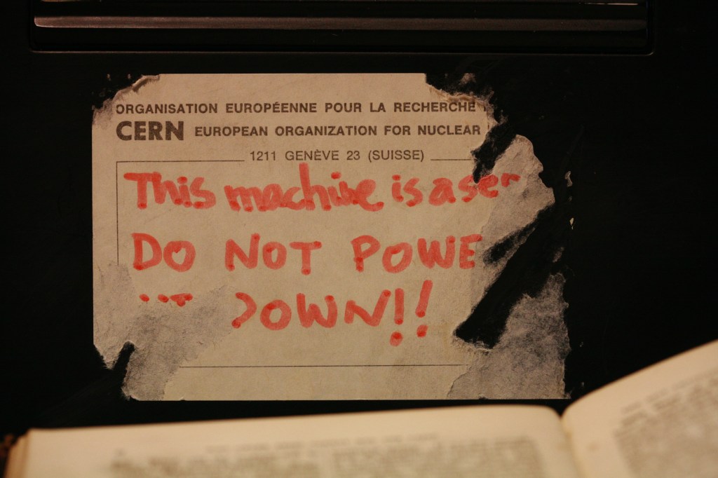 “This machine is a server, DO NOT POWER DOWN!!” Says this note stuck to the back of Tim Berners-Lee’s original NeXT Cube. A black and white computer that was the first web server, and the first web browser, both.